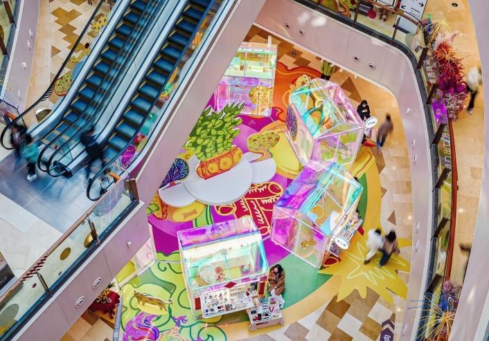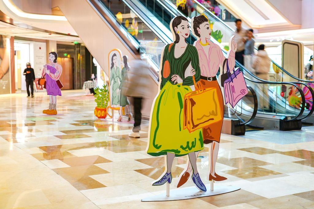 活动季内,兴业太古汇与艺术家龙荻共创商业与艺文交融的动态场域,藉由开放性的创作与展现方式,讲述艺术家视角中的独特“年味”。LG1中厅、北厅及L2北厅内,多点位且兼具互动性的艺术装置。“花影心居”演绎都市女性美妆场景;“聚宝灵韵”结合文博灵感,策源于上海博物馆馆藏,以跨越历史的节庆文化符号触动当下的日常;悬挂在L2北厅的作品“春之吉祥发财大草原”灵感来源于上海博物馆的藏品戈鸮卣上蛇纹鸡和凤凰,恰好吻合兴业太古汇不同角度的建筑外观,艺术家龙荻结合这两种形象,描绘“鸡蛇呈祥”的画面,灵蛇、凤凰、祥牛、富贵竹等形象营造生机勃发又绚丽多彩的祥和氛围,传递美好的新春祝愿。LG1美妆大道沿路放置的“锦绣琳琅”5组人形立牌,勾画出充满生机与活力的新春购物场景,与消费者实现艺术和生活、和情感的共振。